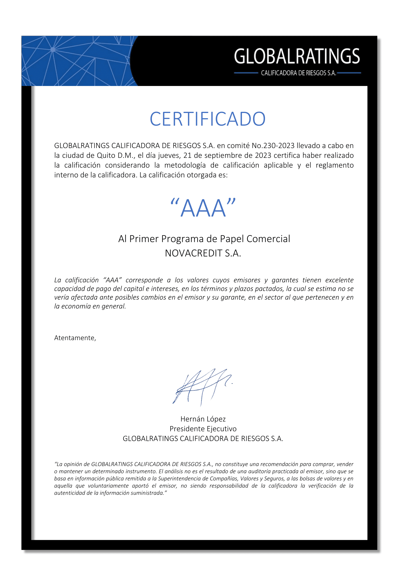 En NovaCredit estamos orgullosos en convertirnos en la primera empresa generadora de cartera automotriz en recibir calificación “AAA” en el primer programa de Papel Comercial. Esta calificación, otorgado por Global Ratings Calificadora de Riesgos S.A., nos consolida como líder en el sector, destacando el compromiso con la excelencia y la responsabilidad en nuestras prácticas comerciales.
